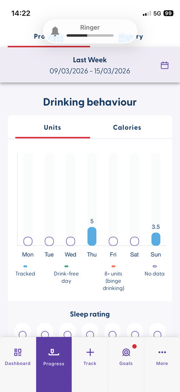 drink no more than 10 alcohol units per week with one drinking session generally not exceeding 50% of the total allowance. I will truthfully record daily ABV consumption on the Drinkaware app. 2 pre-agreed days of max. 14 units per day are allowed (including allowance for the rest of the week).