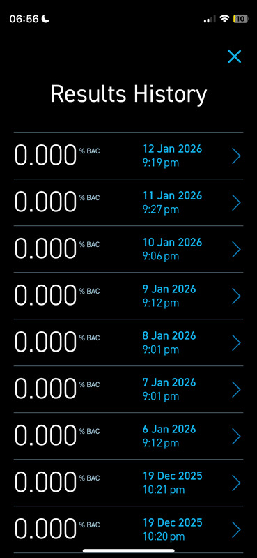 drink no more than 10 alcohol units per week with one drinking session generally not exceeding 50% of the total allowance - I will measure my blood alcohol content (BAC) with a BACtrack device each time 10 mins after my last drink and also take an added breathalyzer (accountability) test every day at 9.30 pm GMT, regardless whether I have drunk alcohol that day - 2 pre-agreed days of max. 14 units per day are allowed (including allowance for the rest of the week)